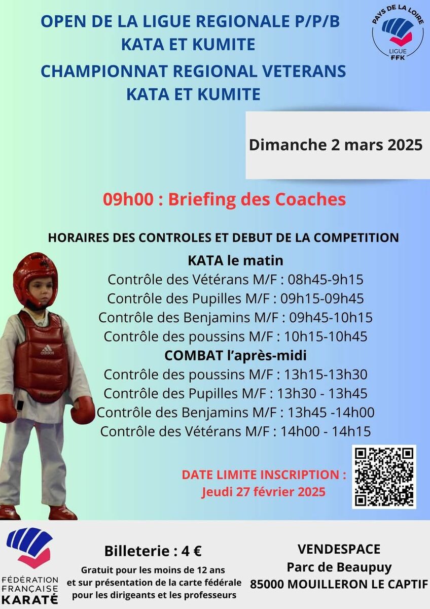 Inscriptions pour l'open régional kata/kumité auprès de Marie-Anne Mallet. Les Pupilles/Benjamins sélectionnés pour la coupe de France ne peuvent pas participer à cette rencontre sportive sélective pour le niveau national.